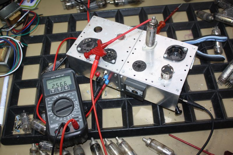 Het schema toont wat op de bovenstaande foto in de praktijk wordt uitgevoerd. We zien op de meter een aanwijzing van 256 uA. De waarden over de hele range van deze 5 buizen liepen echter sterk uiteen tussen 20 en 256 uA. Voldoende evidentie om te stellen dat de hierboven afgebeelde buis de beste kathode zou bezitten.