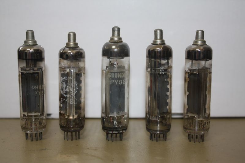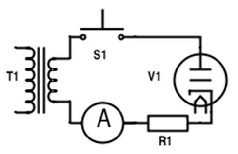 Vanuit het idee dat de kwaliteit van de kathode/gloeidraad beoordeeld zou kunnen worden aan de hand van het Edison-effect, heb ik hiervoor een vijftal gebruikte gelijkrichtbuizen PY88 gemeten volgens onderstaand schema.